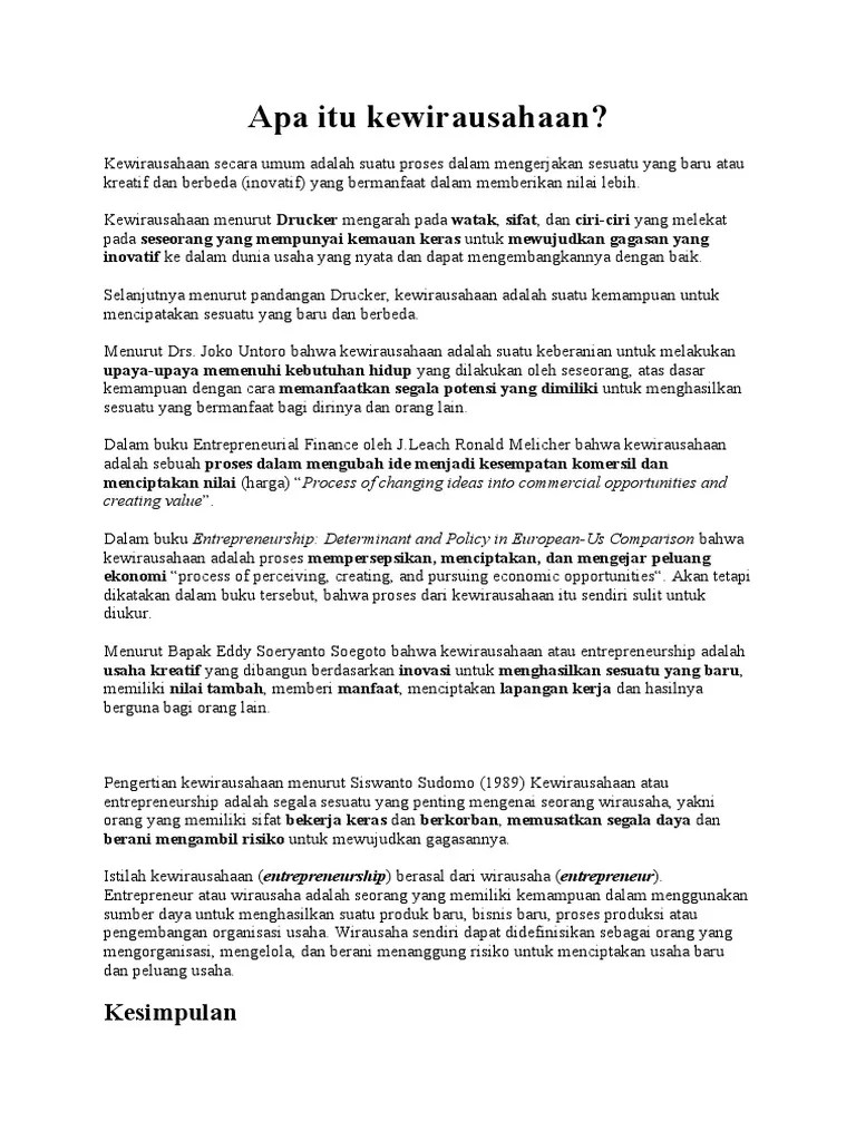 Sebenarnya definisi kewirausahaan itu cukup bervariasi, tapi di sini kita coba buat definisi kewirausahaan ini secara umum dan bahasa . Pengertian wirausaha adalah kemampuan untuk berdiri sendiri mengejar peluang yang menuntut kemampuan . Dari sisi wirausaha, seseorang dituntut untuk lincah merespon kondisi ini, baik secara strategi, hasil, dan pasar. Wirausaha atau enterpreneur adalah orang yang memiliki kemampuan melihat dan menilai kesempatan kesempatan bisnis mengumpulkan sumber sumber . Definisi wirausaha berdasarkan kesimpulan pendapat para ahli (secara umum), adalah seseorang yang memiliki kemampuan/keahlian melihat dan . Dari pendapat para ahli diatas dapat kita simpulkan bahwa wirausahawan adalah seseorang yang memiliki keberanian untuk berusaha secara mandiri. Namun, menurut para ahli, seperti yang dikatakan richard cantillon (1755), pengertian wirausaha secara umum adalah seorang bisa menemukan . Ada juga yang menjelaskan definisi kewirausahaan adalah suatu sikap mental seseorang yang memiliki kreativitas, aktif, bercipta daya untuk . Pada artikel ini kita akan membahas secara lengkap mengenai kewirausahaan dan segala seluk beluknya. Kewirausahaan adalah suatu proses dalam mengerjakan sesuatu yang baru (creative), dan sesuatu yang berbeda (inovative) yang bermanfaat memberi .